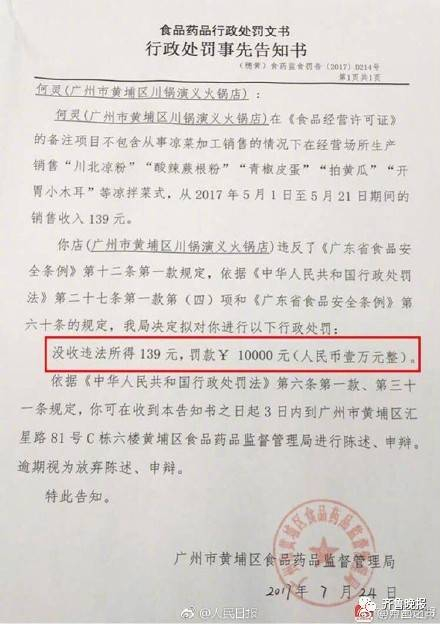黄埔区食药监局相关工作人员表示,该处罚依法依规,并没有故意为难当事人。由于火锅店已关门,食药监局找不到人,才张贴行政处罚告知书,但并不是立即罚款,当事人收到告知书三天内可申辩,若三天内不上门申辩,联系不上当事人的将走公告程序,发出公告60天内,当事人还可以申请行政复议,60天后仍无联系,则交由法院处理。