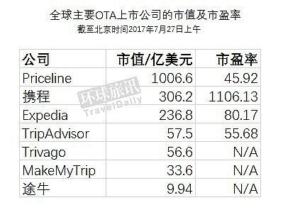 据Google Finance实时数据显示,截至发稿时间,Expedia控股的酒店搜索网站Trivago的市值为56.6亿美元,TripAdvisor的市值为57.5亿美元,印度OTA MakeMyTrip的市值约为33.64亿美元,途牛的市值则为9.94亿美元。