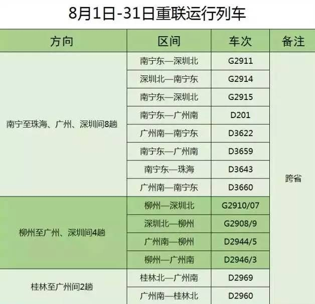 8月1日起,南宁铁路局将再重联39趟动车!其中,8月1-31日,南宁至珠海、广州、深圳间8趟,柳州至广州、深圳间4趟,桂林至广州间2趟,共13趟动车组列车重联运行;8月2日至9月1日,南宁至珠海、广州、深圳间6趟动车组列车重联运行。具体如下: