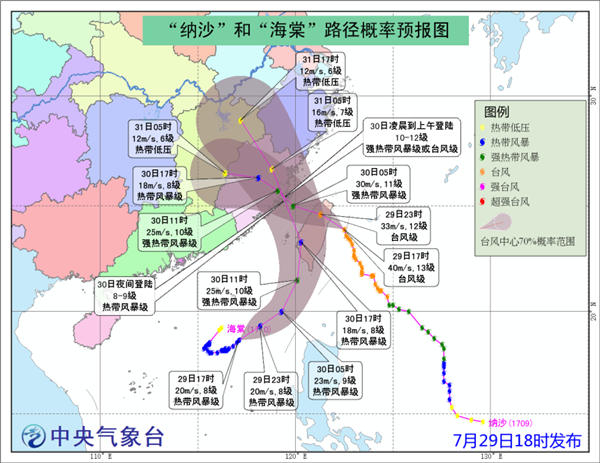 今年第10号台风“海棠”紧随其后,它将在30日白天将擦过台湾西南部沿海后,将于30日夜间在福建霞浦到晋江一带沿海登陆(热带风暴级,8-9级,18-23米/秒)。登陆后,强度迅速减弱,31日白天将与台风“纳沙”减弱后的残余环流合并,以后北上。