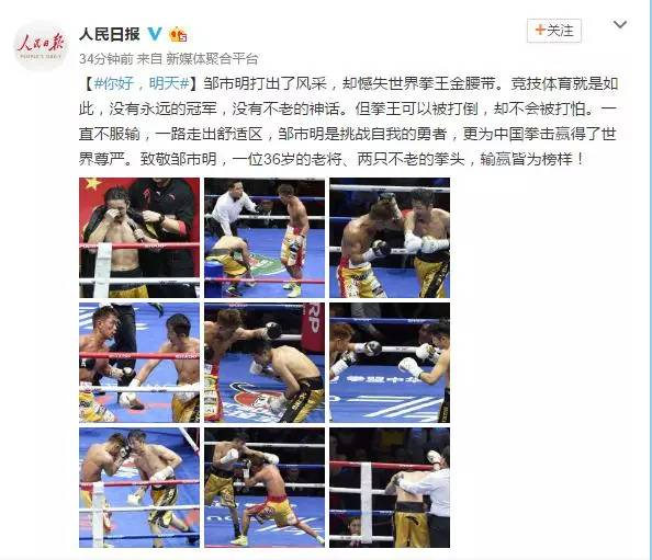 最后,邹市明有些哽咽地表示,“我练了22年拳击,就是为了今天。等我打不动了,等我输掉比赛,这时候如果还有人支持拳击,那我也已经成功了。”
