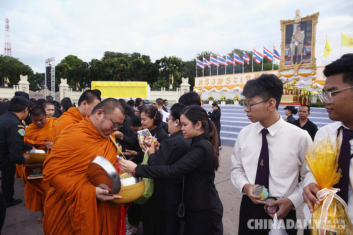 当地时间7月28日,泰国曼谷的皇家广场举行僧侣为国王哇集拉隆功庆祝65岁生日的活动,民众向僧侣们进行施舍。(图片来源:视觉中国)
