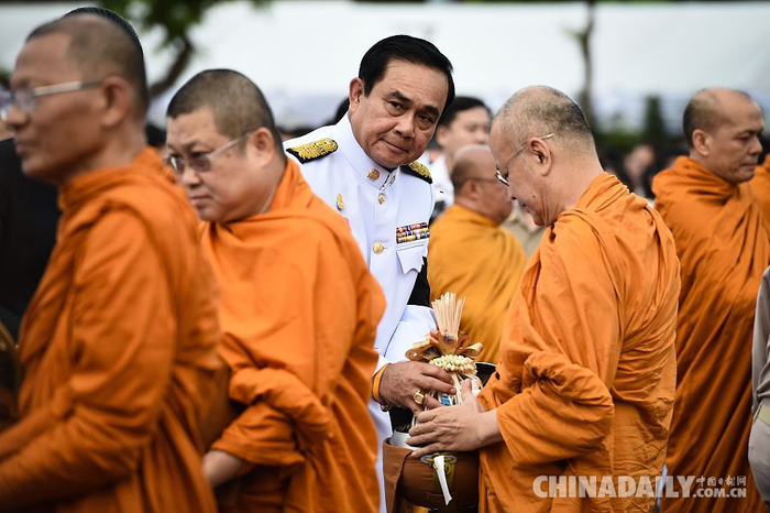 当地时间7月28日,泰国曼谷的皇家广场举行僧侣为国王哇集拉隆功庆祝65岁生日的活动,泰国总理向众佛教僧侣提供施舍。(图片来源:视觉中国)