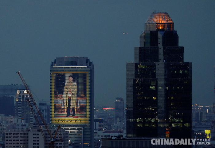 当地时间7月28日,曼谷一座购物中心的外墙投射出国王的肖像为国王庆生。(图片来源:视觉中国)