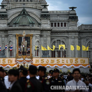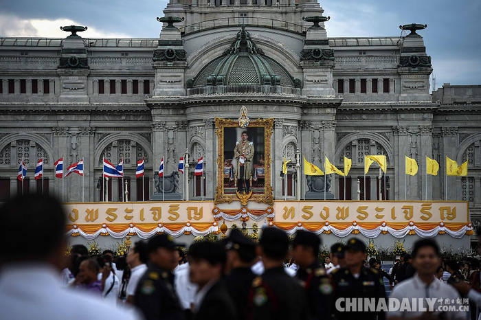 当地时间7月28日,曼谷皇家广场举行泰国国王哇集拉隆功庆祝65岁生日的活动现场。(图片来源:视觉中国)