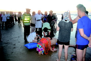 当天风浪较大,溺水男子在海中呛了不少水,被救上岸后出现休克。120医护人员赶到现场前,民警一直为他采取心肺复苏等急救措施,此后男子被120医护人员接回医院。