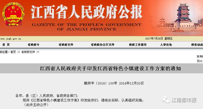 江西省特色小镇建设工作方案的通知中