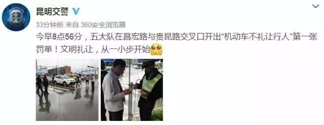 7月21日起,昆明交警开始充分运用目前的交通管理科技手段,利用电子监控设备抓拍“不礼让斑马线”的交通违法行为,一旦被抓拍到,将严格按照交通法律法规进行处罚:处200元罚款,同时记3分。