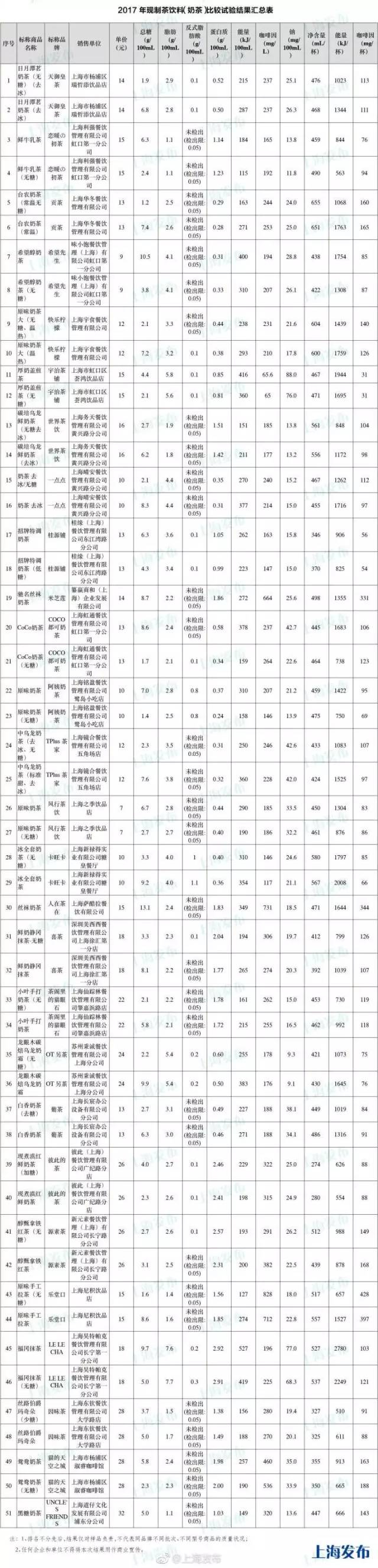 试验人员在27家奶茶铺中,共购买了51件奶茶样品,包括喜茶、皇茶、贡茶、一点点等网红奶茶,随后委托上海市营养食品质检站,对奶茶中的糖分、脂肪、反式脂肪酸、咖啡因等进行了检测。