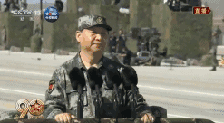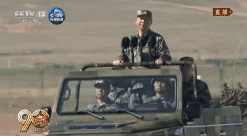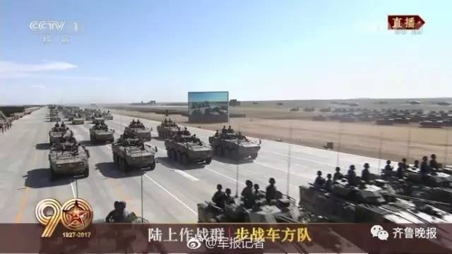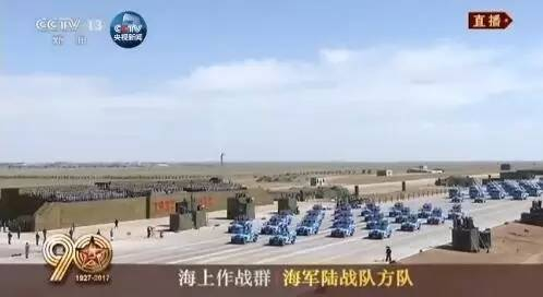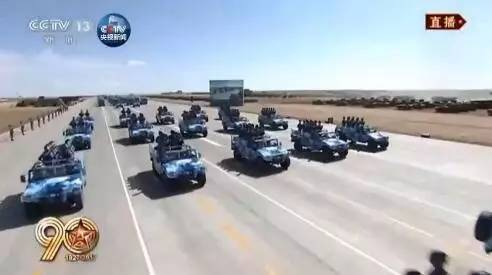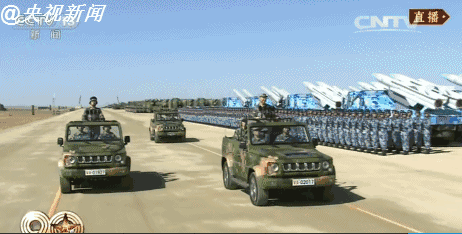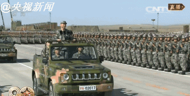 习近平主席乘坐着编号为“02017”的野战检阅车,在演兵场整齐列队的护旗方队、地面作战群和人员方阵。