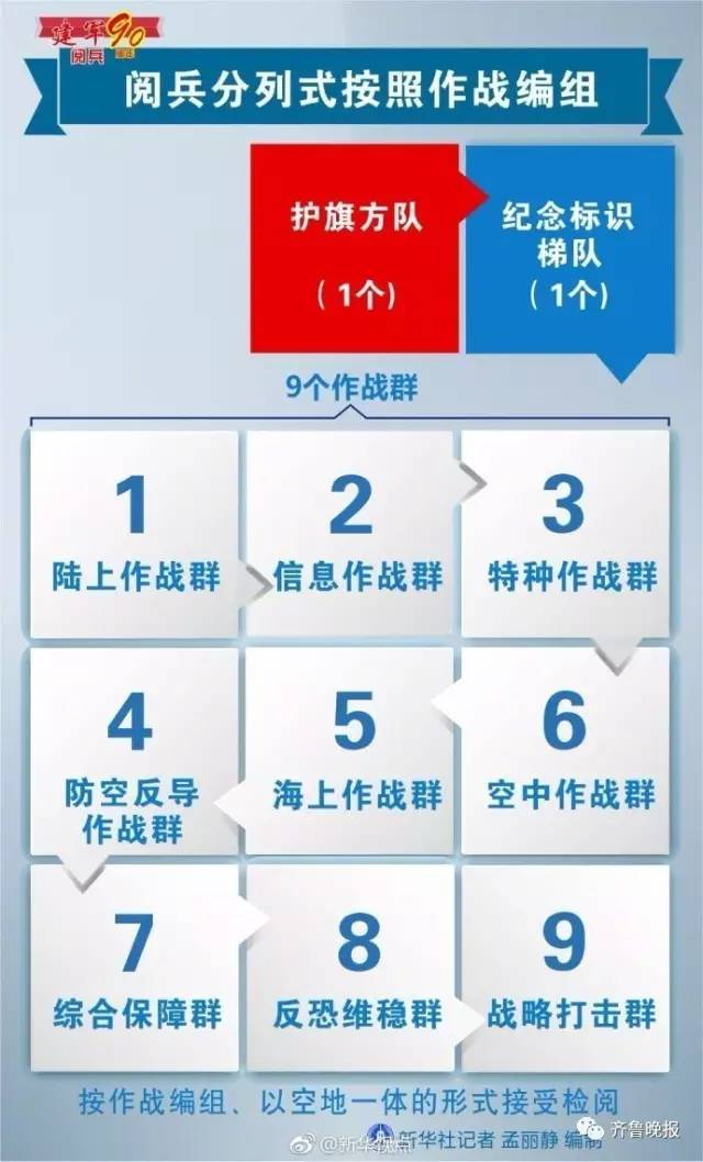 护旗方队、纪念标识梯队和陆上作战、信息作战、特种作战、防空反导、海上作战、空中作战、综合保障、反恐维稳、战略打击9个作战群接受检阅。