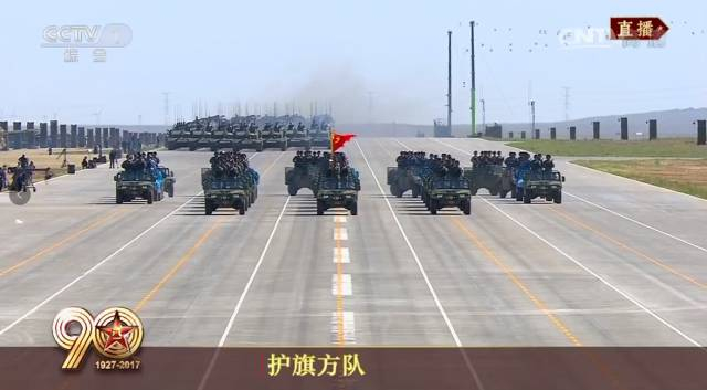 习近平乘车依次检阅在演兵场整齐列队的护旗方队、地面作战群和人员方阵。