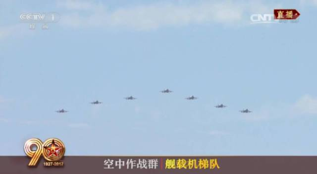 7架歼-15编成舰载机梯队接受检阅。歼-15是我国自主研发的首型固定翼舰载多用途战斗机,也是航母编队核心作战打击力量。