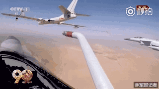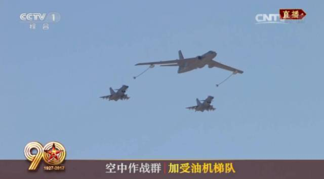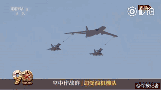 由轰油-6加油机、歼-10C战机组成的加受油机梯队飞临上空。空中加油续航,有效增强了航空兵远程机动、持续作战和战场生存能力,是空中联合作战和远程作战能力的重要体现,中国航空兵由此飞得更高更远!
