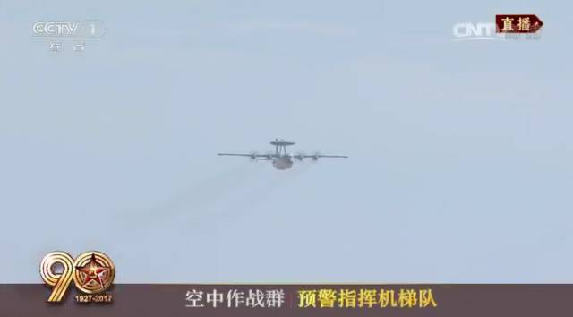 空警-2000预警机、空警-500预警机、运干-8指通机和运干-8干扰机,在8架歼-10B战机的护卫下,列阵长空,接受检阅。预警机、指通机等先进装备的列装,使我军预警和作战指挥控制范围有效拓展。