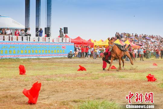 图为哈萨克族牧民表演“马上拾银”。 钟卫亮 摄