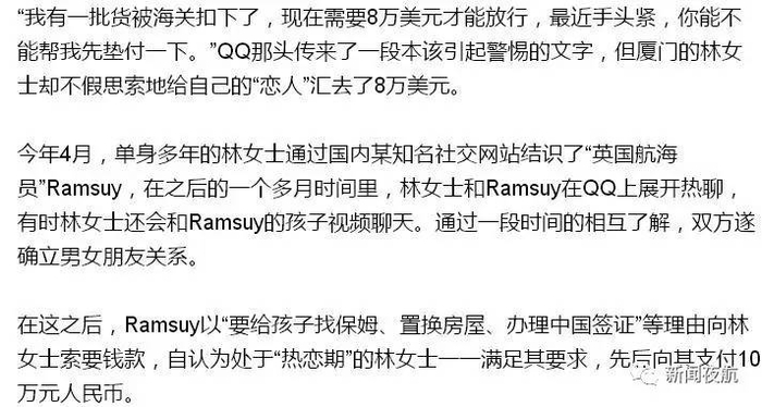 没过多久,林女士收到Mark发来的消息,称自己因在战斗中受伤,会得到一笔约合500万元人民币的赔偿金,而他想把这笔钱赠予林女士,但4万元的邮费需由林女士承担。已被爱情和金钱冲昏头脑的林女士很快将4万元转账给Mark。