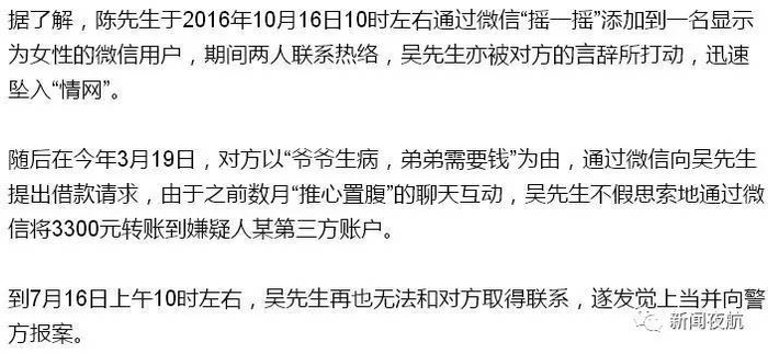 今年7月17日,事主吴先生向厦门警方报案,称自己在使用微信“附近的人”交友时上当受骗。