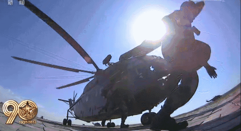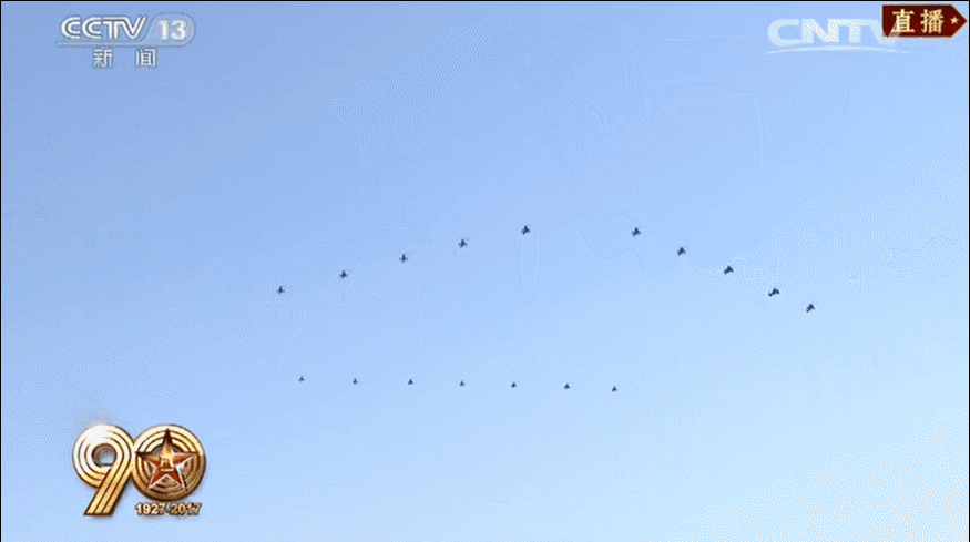 纪念标识梯队精彩亮相,17架直升机组成“八一”标识,24架直升机绘出“90”字样,象征着人民军队走过了90年光辉历程。