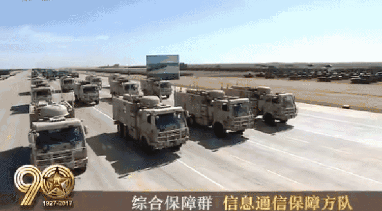 由信息通信保障方队、工程防化保障方队、后勤保障方队、装备保障方队组成的综合保障群接受检阅。