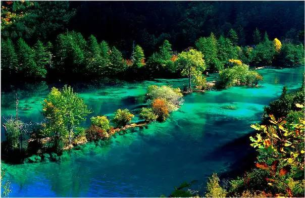 沟内遍布原始森林,分布有108个湖泊,处处可见清水绿荫,明净清冽,令人心旷神怡。