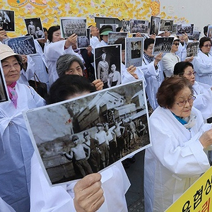 当地时间2016年4月6日,韩国首尔,日本驻韩大使馆前,二战期间被强征到日本的韩国劳工受害者家属们召开新闻发布会。来源:视觉中国