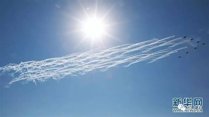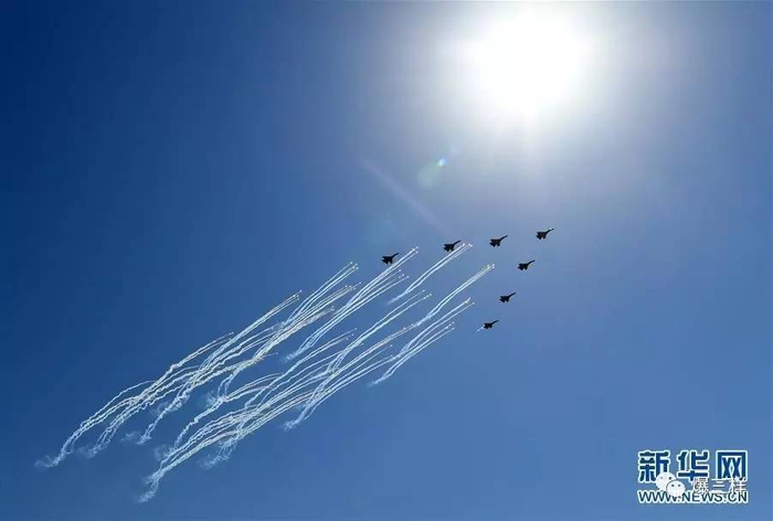 阅兵式上最激动人心的一刻到来了!15架战机编成歼击机梯队呼啸而来接受检阅。3机楔队为歼—20战机,5机楔队为歼—16战机,7机楔队为歼—11B战机,作为体系作战的“刀尖”,它们以利剑般的队形接受检阅,并释放出绚烂的红外干扰弹,向人民军队90华诞献礼!