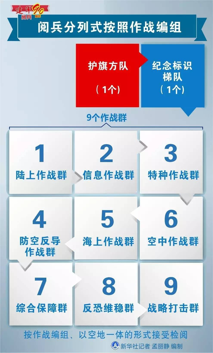 今天接受检阅的共有12000名官兵、600余台(套)装备,将组成1个护旗方队、27个地面方队和9个人员方队;陆海空三军航空兵100多架战机编成1个纪念标识梯队、1个空中突击梯队和6个空中梯队,从东北、华北6个机场起飞。其中40%的装备是第一次亮相。