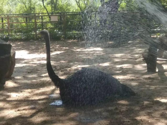 在鸟区,饲养员们赶在夏季夏季之前,在大部分区域都调试好了喷淋头;金丝猴一身美丽的金毛,虽然美丽,但夏天真的很热,饲养员只能不断给它们开喷淋头降温;就连平时最调皮的大象“莫莫”,也老老实实待在那里,等待饲养员们为它喷水降温,喷完一侧还会自觉转身享受另一侧的清凉;饲养员冲洗笼舍时,鸸鹋也会凑上来,蹭着如花洒般的水,肆无忌惮地洗澡……