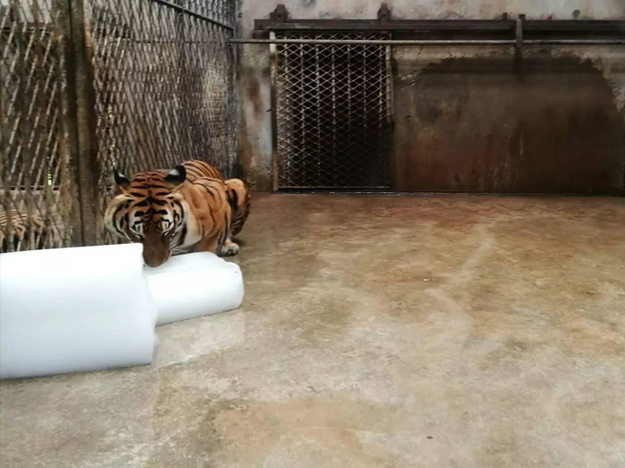 华南虎见了冰块立即成了“小猫”,近乎“温柔”地一直“蹲”在冰块边;熊科动物看见冰块觉得新奇,一会儿就把它们暴打成碎冰。