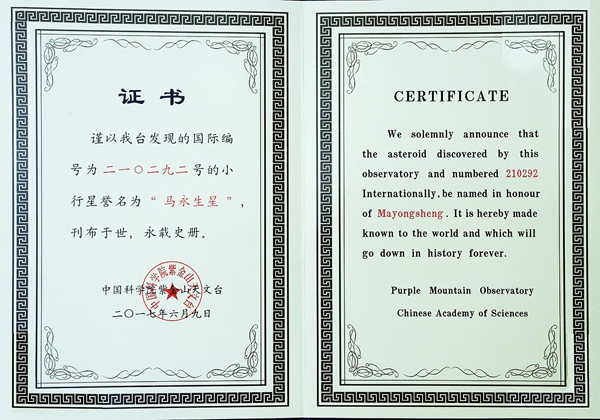 中国科学院紫金山天文台颁发的“马永生星”证书。来源:中国石化新闻网