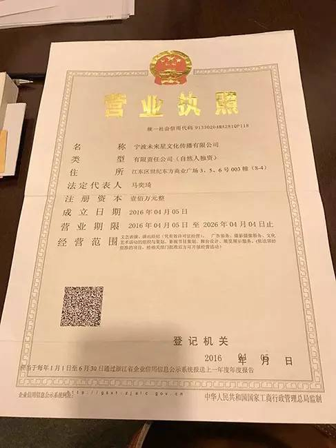 未来星营业执照经了解,宁波未来星文化传媒有限公司,位于江东区世纪东方商业广场3、5、6号003幢(8-4),法定代表人叫马奕琦,该公司成立于2016年4月5日,经营范围为:文艺表演、演出经纪、广告服务、摄影摄像服务、文化艺术活动的组织与策划、影视节目策划、舞台设计、展览展示服务等。