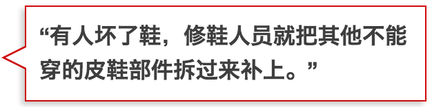 他告诉北京时间记者,训练期间,皮鞋一个月就走坏一双,但是物质条件所限,不能再发新鞋,于是每个连队成立了一个修鞋组。