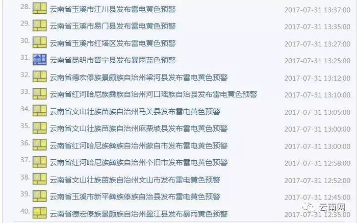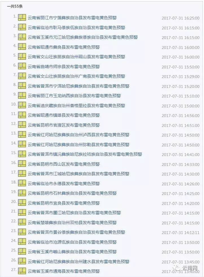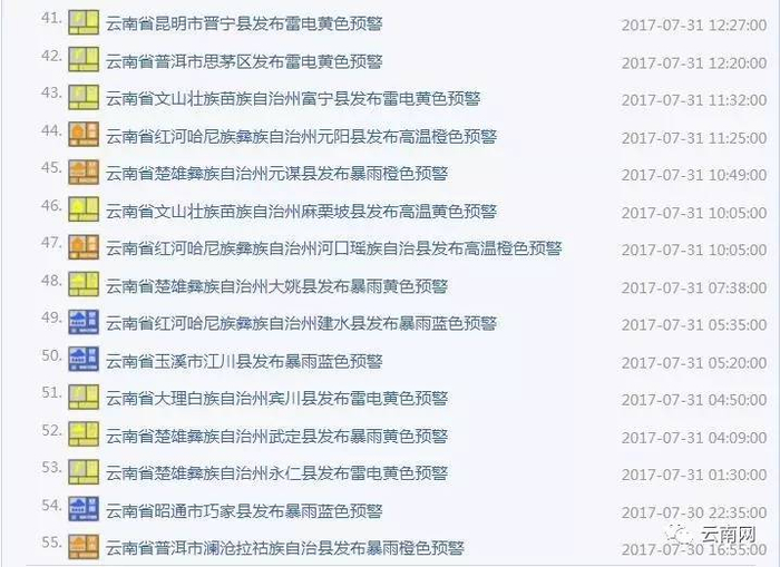伴随着强降雨天气而来的,还有一波气象灾害警报与预警信息。截至7月31日16时25分,中国天气网云南频道未解除的预警多达55个,其中31日的预警有53个。