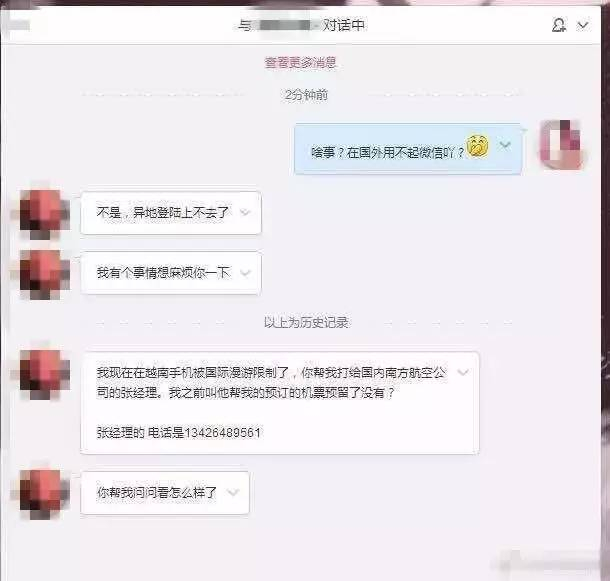 “薇薇”私信郭霞称,手机被限制国际漫游,请她帮忙在国内打电话联系南方航空公司王经理,询问预定的2张、共计8600元的机票是否留好。