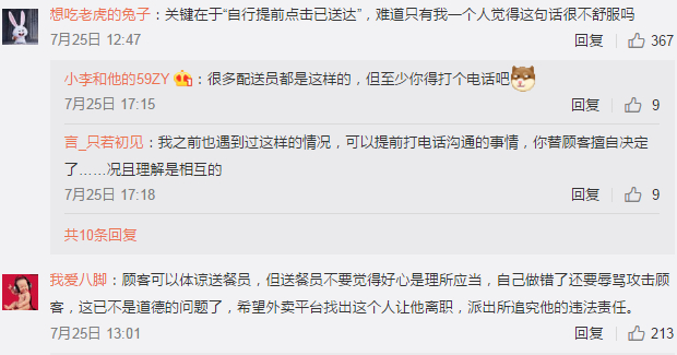有部分网友对送餐员表示同情,认为这么热的天,送餐员也不容易,应该相互体谅下。但多数网友认为小王并没有做错:顾客可以体谅送餐员,但送餐员不要觉得好心是理所应当,自己做错了还要辱骂攻击顾客,这就不对了……
