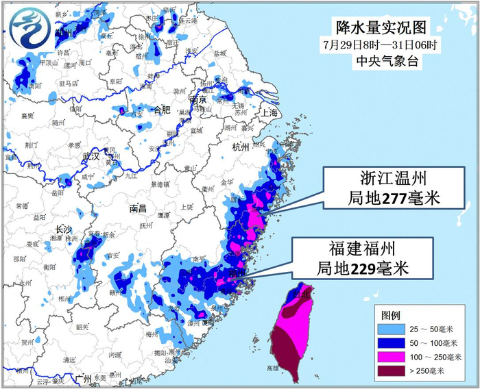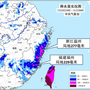 受双台风共同影响,29日早晨至今,浙江东部、福建东北部、江西西部等地累计降雨量超过100毫米,浙江温州、福建宁德和福州等地200~277毫米;台湾屏东、高雄、宜兰等地累计雨量超过500毫米。