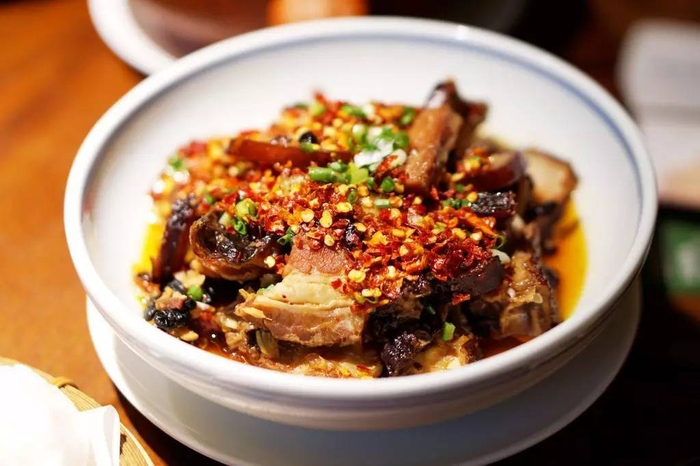 老腊味合蒸里有腊肉、腊鱼和腊鸭三种腊味,腊香浓重、咸鲜适口、柔韧不腻。
