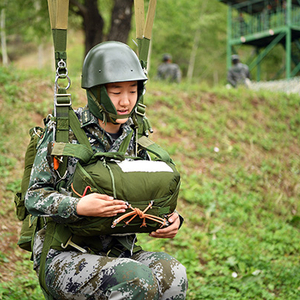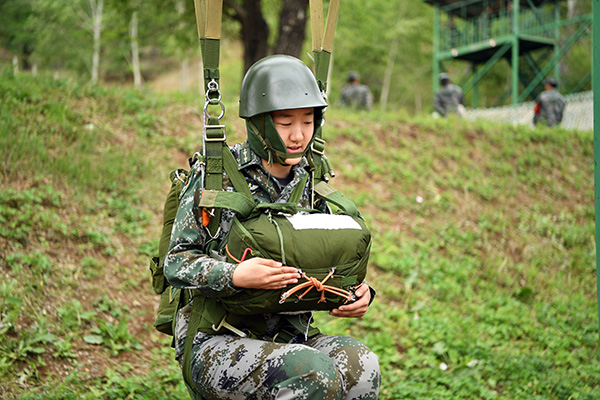 正在练习模拟伞降的赵露,姿态准确无误,胸前抱的是备用伞包。