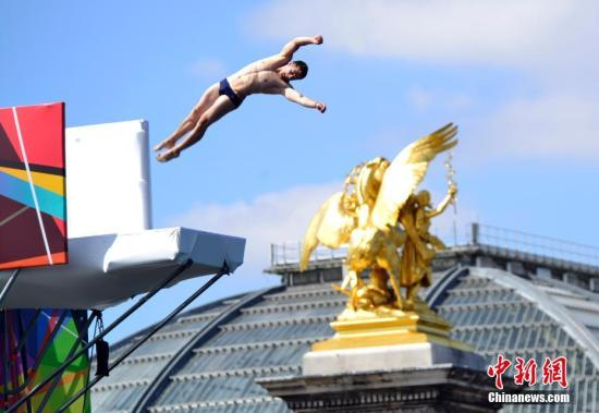 6月23日,正在申办2024年奥运会的巴黎市政府以塞纳河和著名的亚历山大三世桥为“舞台”举行“奥林匹克日”活动,向民众推广奥运会体育项目,并组织市民参加运动体验。图为跳水运动员在塞纳河上为市民表演。 中新社记者 龙剑武 摄