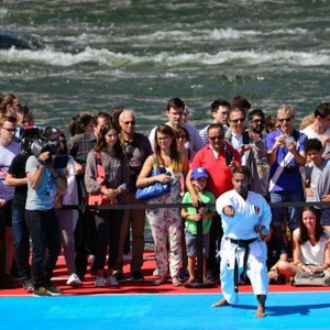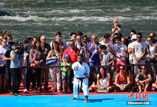 6月23日,正在申办2024年奥运会的巴黎市政府以塞纳河和著名的亚历山大三世桥为“舞台”举行“奥林匹克日”活动,向民众推广奥运会体育项目,并组织市民参加运动体验。图为空手道运动员为市民展示这一东京奥运会新增项目。 中新社记者 龙剑武 摄
