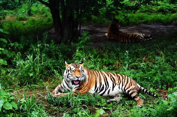 7月17日,在黑龙江东北虎林园散放区,两只东北虎在树荫下休息。新华社记者 王建威 摄