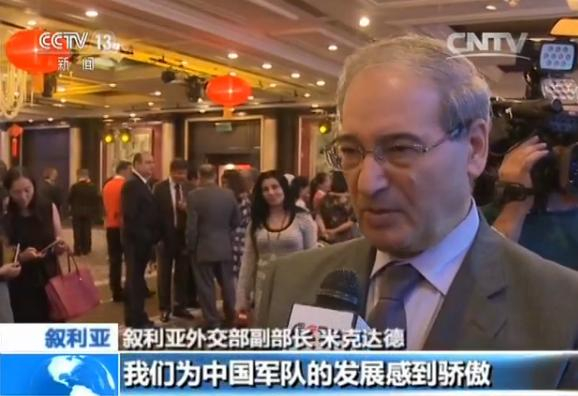 叙利亚外交部副部长 米克达德:我们为中国军队的发展感到骄傲。中国军队的建立是为了和平及安全,世界的和平与中国人民的安全,中国军队已经发展成全球最重要的军队之一,但中国军队从不滥用其手段,中国军队维护了世界的和平与稳定。