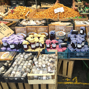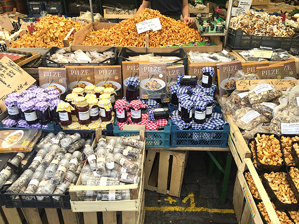 比如,一过德国边界,就可以看到市场里的面包摊会卖打了结像是一副扭曲的眼镜的椒盐卷饼(pretzel)和各种结实的酸面包。没有这两样的面包房,在德国是不存在的。再往南边去慕尼黑,市中心的谷物市场(Viktualienmarkt),就可以看到慕尼黑著名的白香肠,粗细不等,肉呼呼的,像要从肠衣里爆裂出来。那里还可以看到一堆一堆新鲜的黄色鸡油菌,一颗颗漆黑而完整的松露。慕尼黑靠阿尔卑斯山,所以蘑菇也比别处要多。
