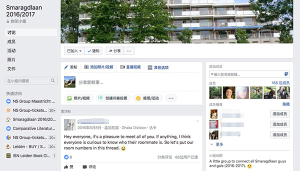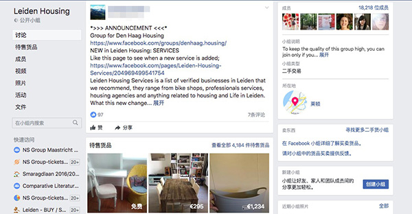 我在莱顿这一年也住在学生公寓中,对青年人带给租房生活的活力深有体会。我所居住的“司马楼”(注:荷兰名为Smaragdlaan,中国学生按照发音给这栋楼拟了一个中国风的名字)有一个微信群和一个Facebook群,都是房客自发组建的。因为大家都是临时的租客,不可能买齐所有要用的东西,大家就会在群里互相借东西,有时候也会提供其他帮助。房客要搬走或是离开莱顿时,还会在群里发布转卖家具和生活用品的信息。