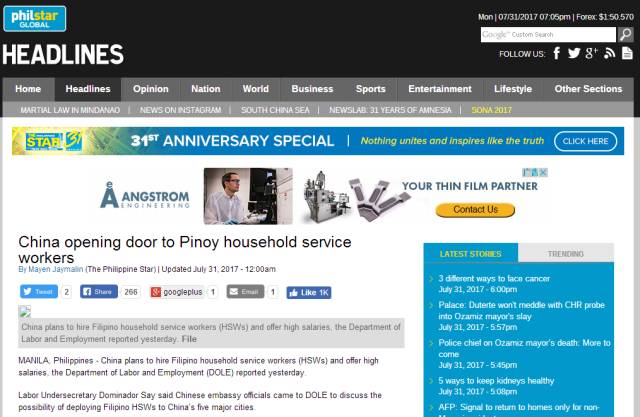 记者搜索发现,最先报道这一消息的是菲律宾媒体《菲律宾星报》。该报网站发布了一篇题为“中国向菲律宾家政服务人员敞开大门”的报道。