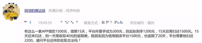 目前有一个网贷APP,若借款1500元,借期15天,平台所收手续300元,则实际到手1200元,15天后需归还1500元。若15天后未归还,则一天收取40元的逾期费。我朋友在该平台借款1500元,逾期20天,平台要求他归还2200。请问平台这样收费合法吗?