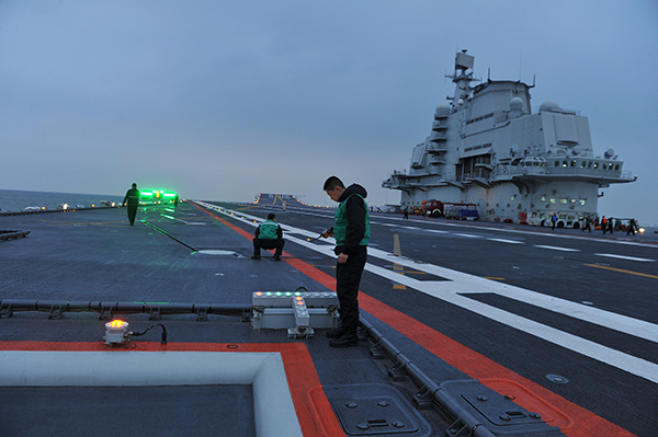 辽宁舰上,航空部门官兵在飞行甲板上检查灯光设施。 视觉中国 资料图