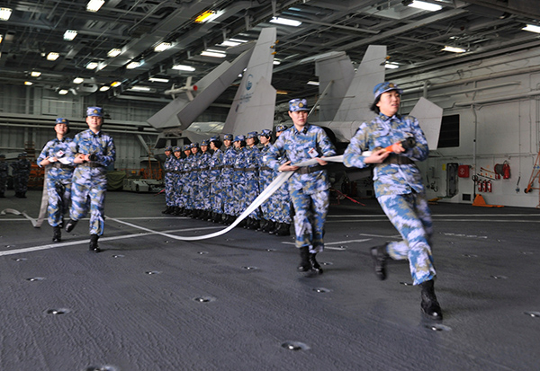 2014年2月24日,辽宁舰上的女兵在进行操演。 视觉中国 资料图