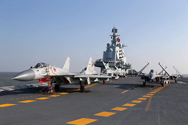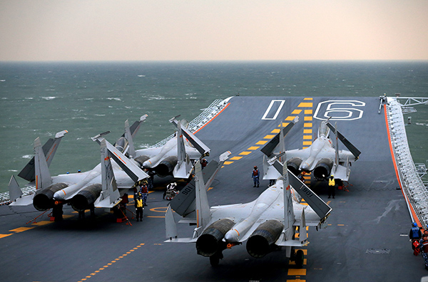 2015年12月24日,歼-15舰载战斗机列阵辽宁舰飞行甲板。 视觉中国 资料图